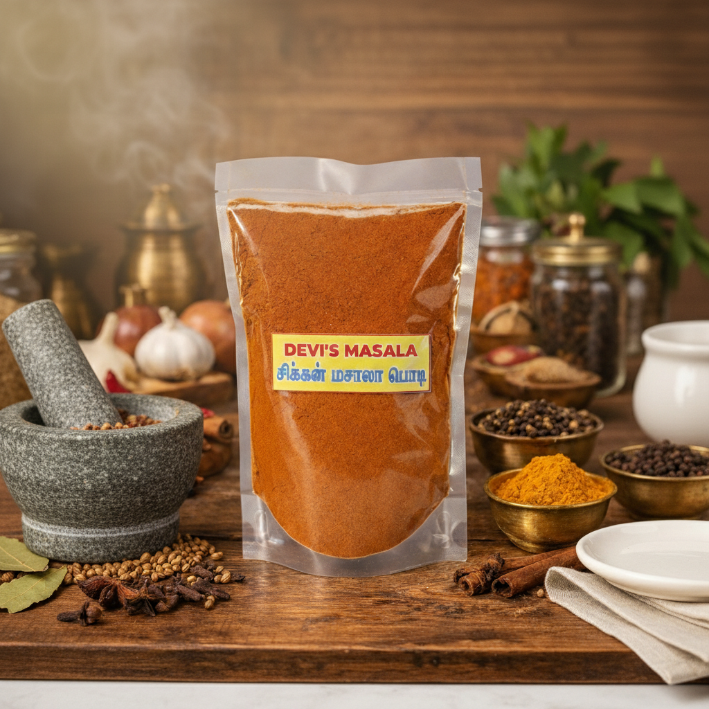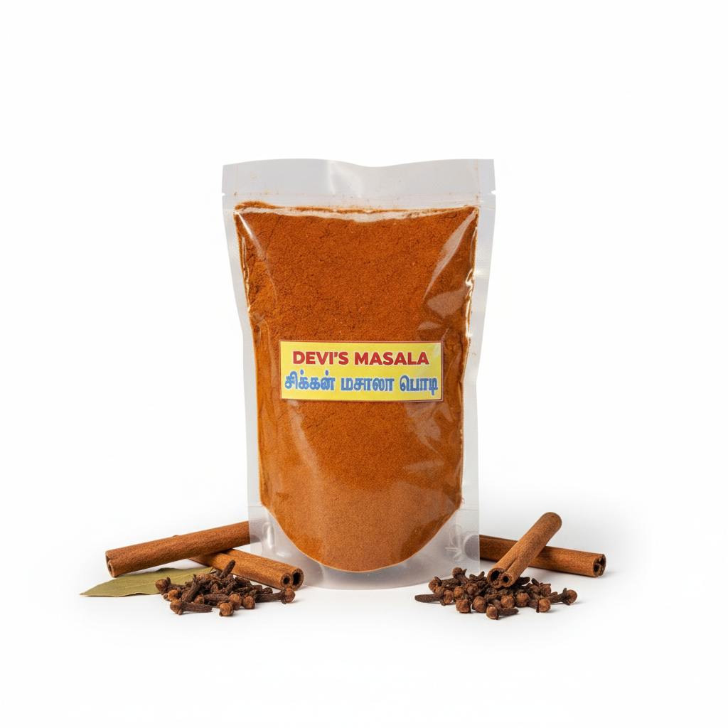 DEVI’S MASALA Chicken Masala (சிக்கன் மசாலா) is a traditional Tamil-style spice blend specially crafted to enhance the taste of chicken dishes. Made from carefully selected, high-quality spices, this masala delivers rich aroma, deep color, and perfectly balanced heat for flavorful curries and gravies.