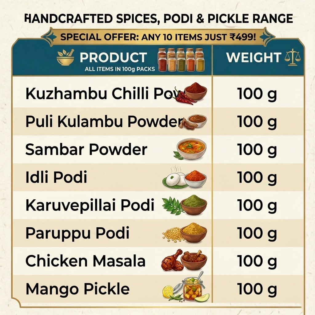 Each item is made following traditional homemade recipes, ensuring the perfect balance of taste, quality, and freshness. From spicy, tangy pickles to flavorful podis, this combo is designed to elevate your everyday meals with a true homemade touch.