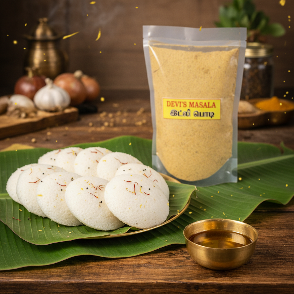 DEVI’S MASALA Idli Podi is a traditional Tamil Nadu spice blend specially crafted to enhance the taste of idli and dosa. Made from carefully selected and freshly roasted ingredients, this podi delivers rich aroma, balanced spice, and authentic homemade flavor.