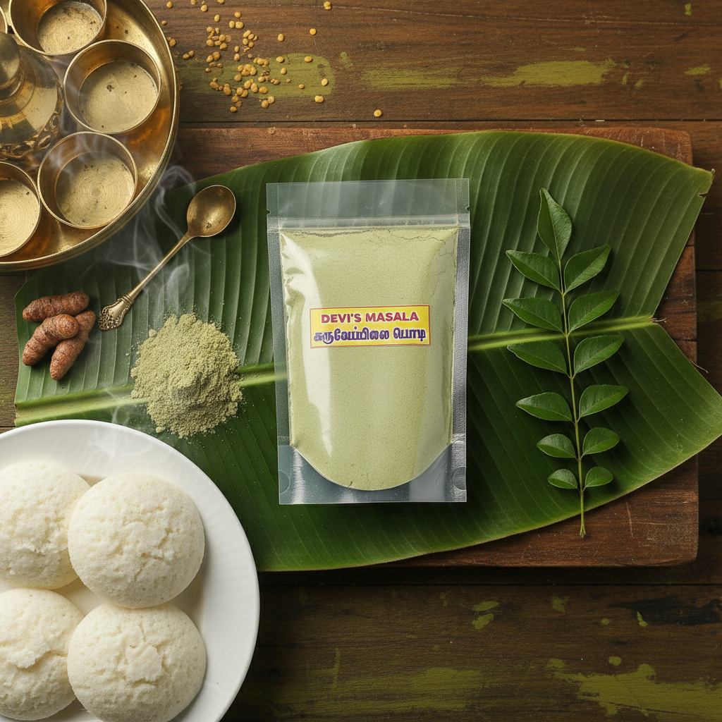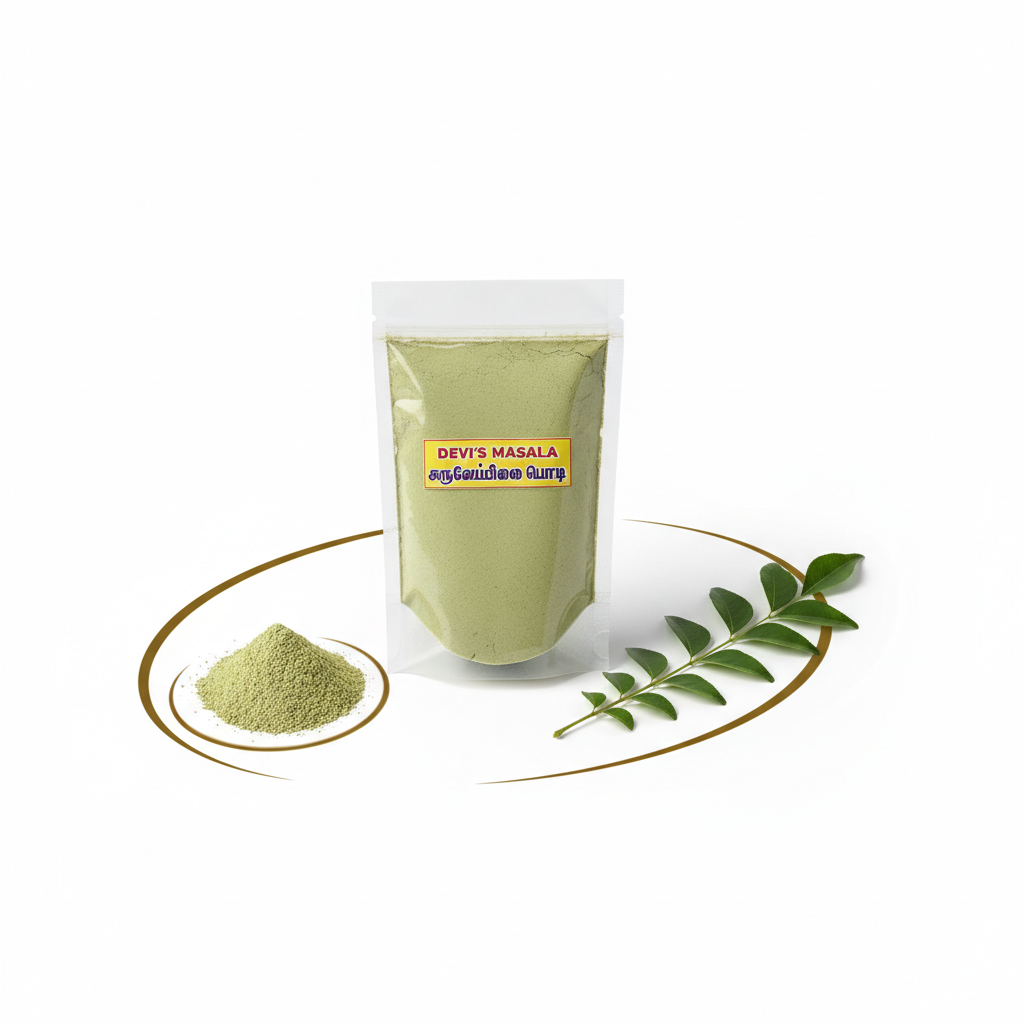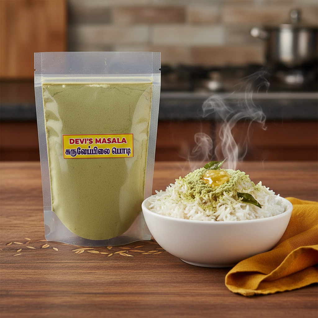 DEVI’S MASALA Karuveppillai podi is a traditional Tamil Nadu spice blend specially crafted to enhance the taste of rice with some Gingelly oil . Made from carefully selected and freshly roasted ingredients, this podi delivers rich aroma, balanced spice, and authentic homemade flavor.